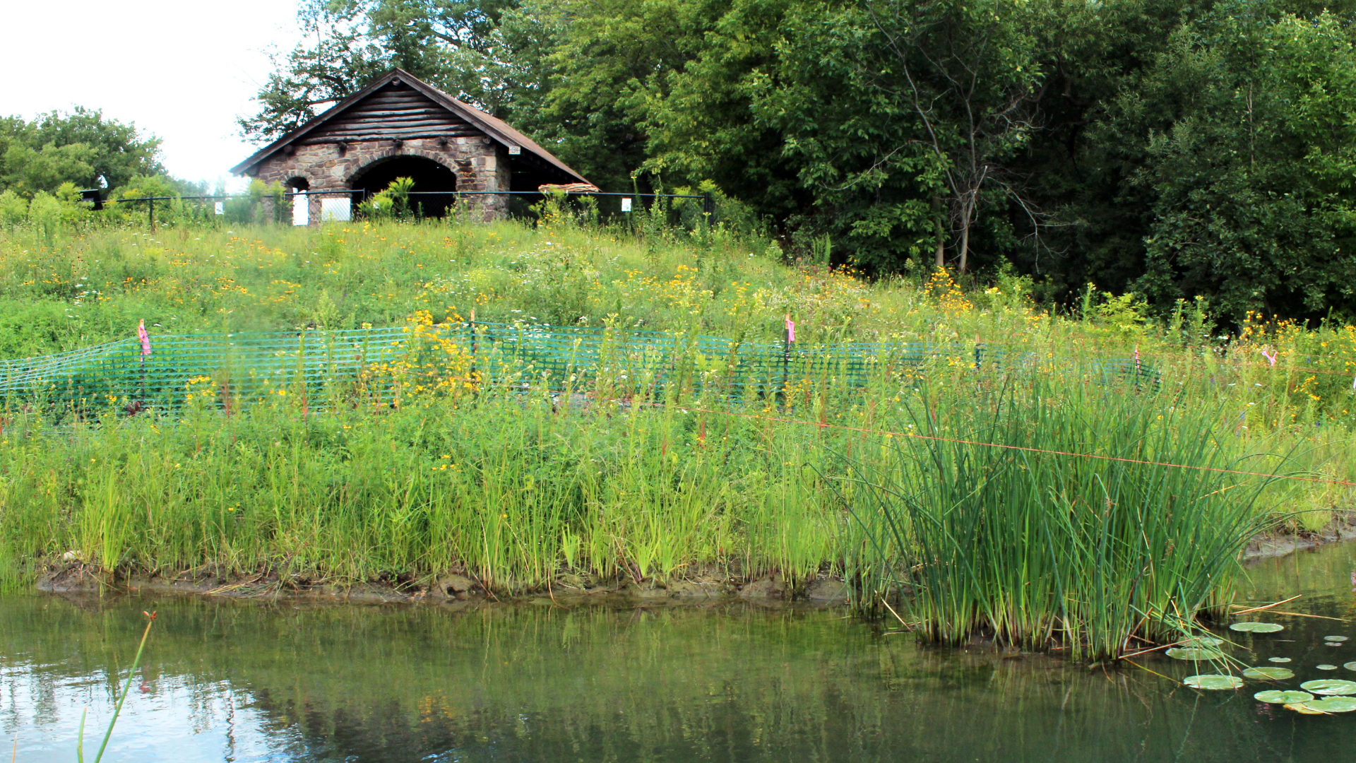 A variety of native plants not only strengthens the shoreline, but also attracts birds, bats, and frogs, which are natural predators of pest species like mosquitoes.