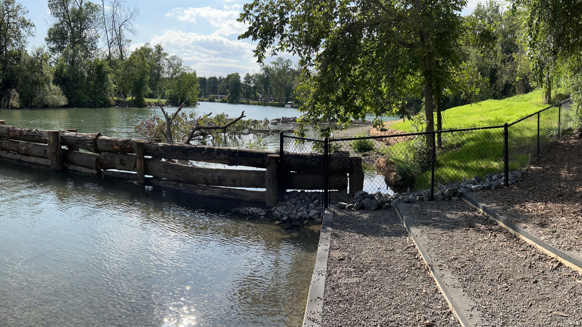 The stabilized water access point improves the park experience while reducing turbidity and shoreline disturbance historically caused by unrestricted dog activity in shallow water areas.