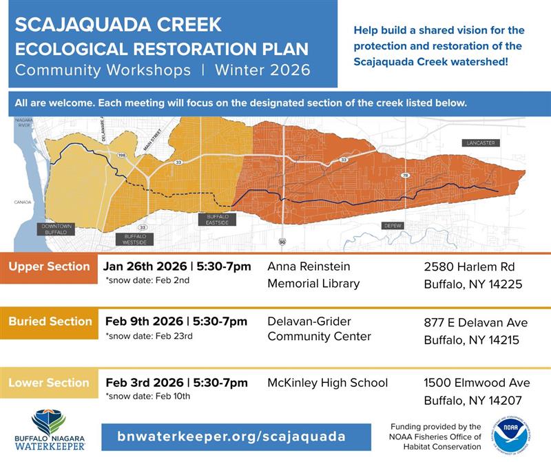 Buffalo Niagara Waterkeeper is hosting a series of workshops for people who want to learn more about the Scajaquada Creek Ecological Restoration Plan, meet the project team, and provide your input on the best areas to implement restoration and resiliency projects in the watershed.