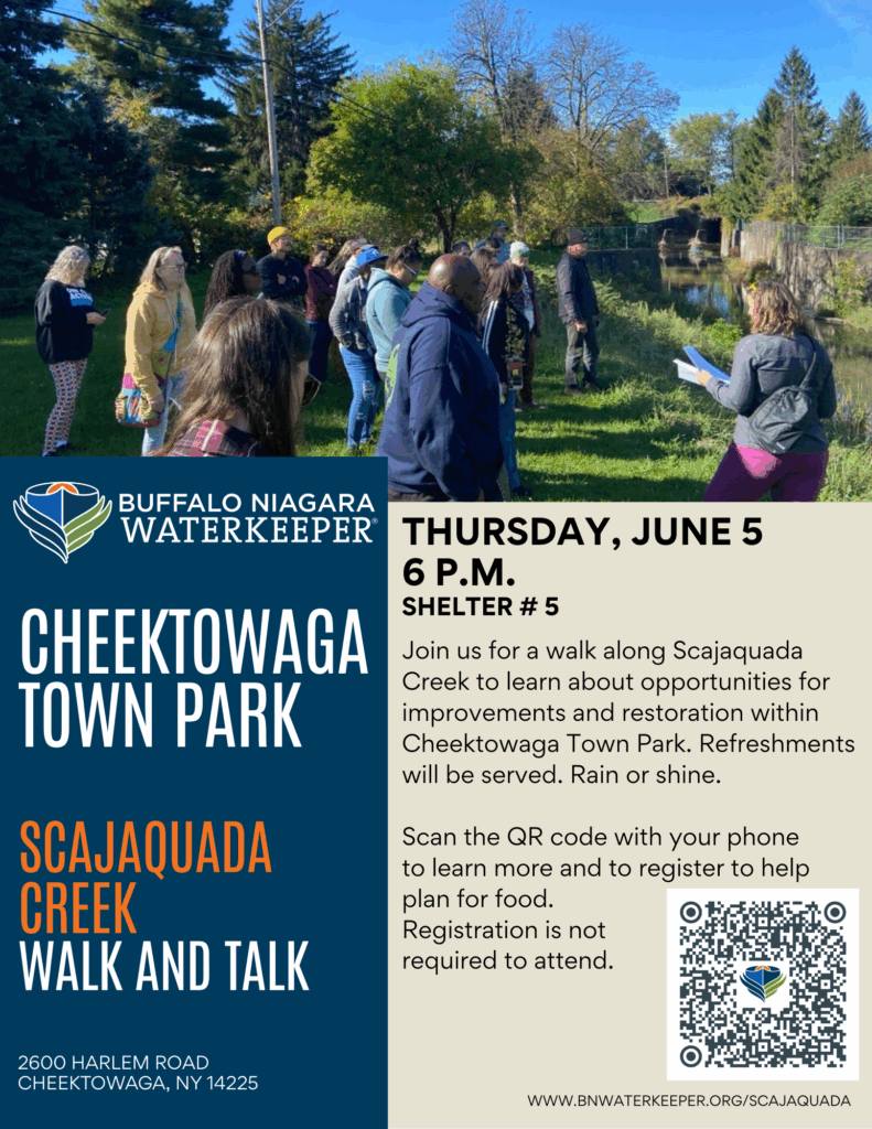 Join us for a walk along Scajaquada Creek to learn about opportunities for improvements and restoration within Cheektowaga Town Park at Shelter #5. It is Thursday, June 5 at 6 p.m.