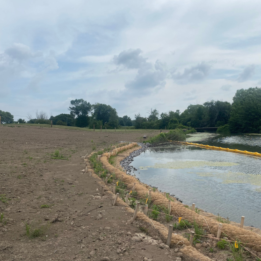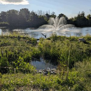 Additional restoration elements include nearby meadow plantings, the creation of additional wetland habitat, and tree plantings along the shoreline. A fountain was also installed in the lake to help with aeration.